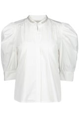 The Cate Ruched Sleeve Top reimagined in a crisp poplin, featuring an embellished collar. The button front closure keeps it polished, while the ruched sleeves adds a sense of femininity. Dress it up with tailored trousers or dress it down with your favorite jeans.