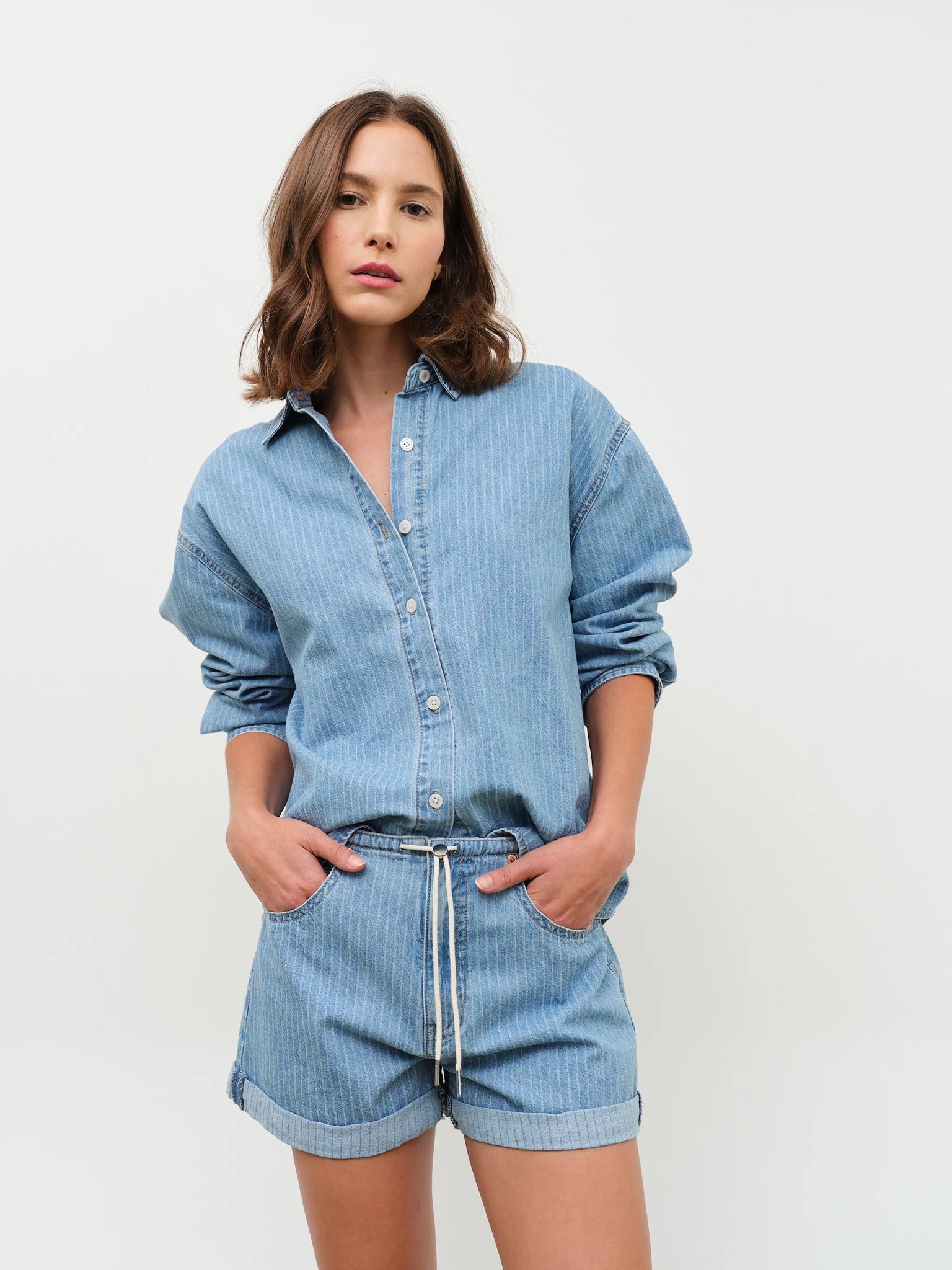 The Haven Long Sleeve Shirt in Whimsy is an easy oversized button-up designed for effortless layering. Featuring a soft light wash with subtle vertical striping, this relaxed silhouette pairs perfectly with the Maddie Short or Madison Wide Leg in Whimsy for an easy head-to-toe look.