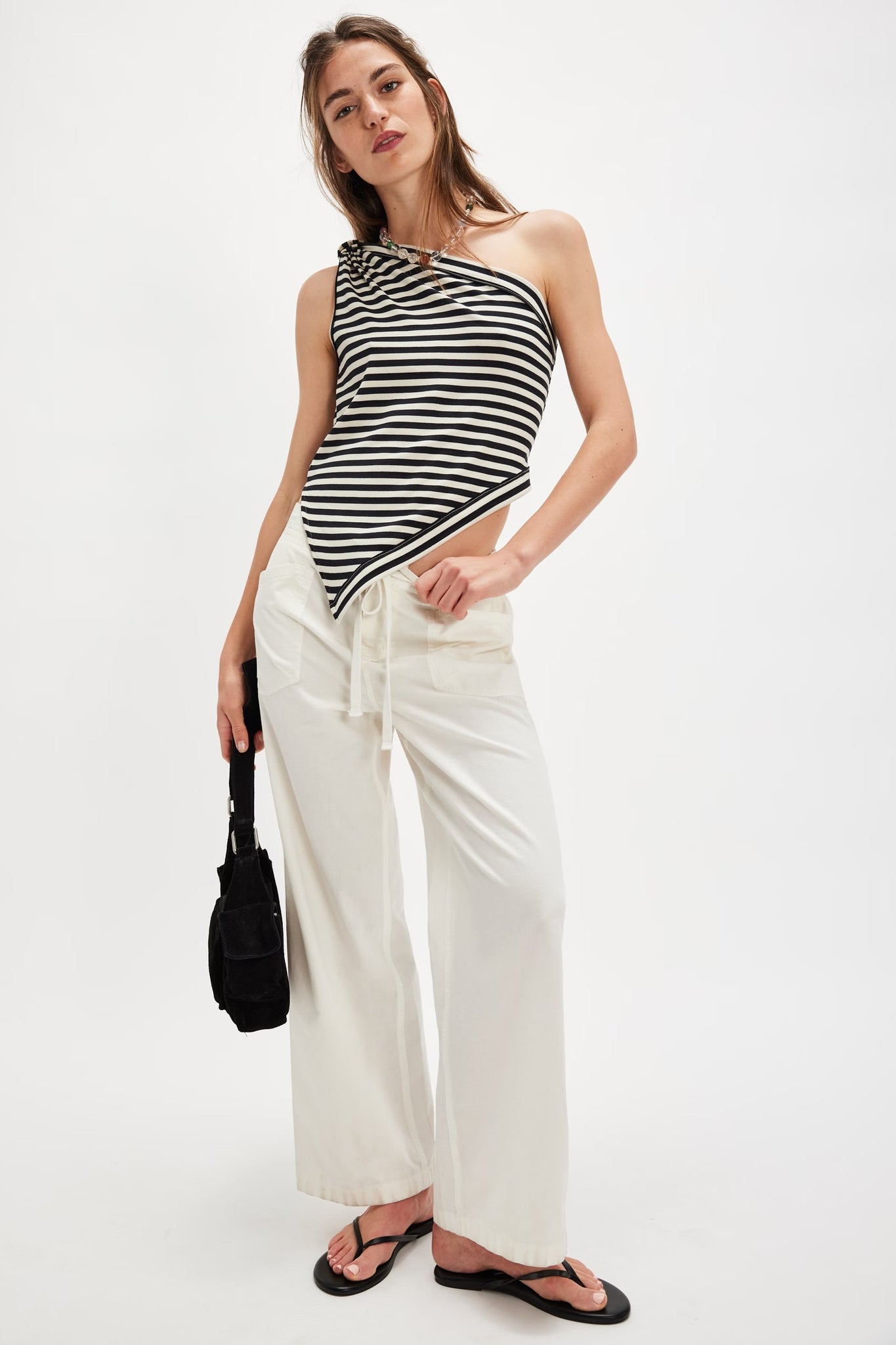 Knotted details, bold stripes, and an asymmetrical hem make this one-shouldered top an absolute show-stopper, no matter what you pair it with.