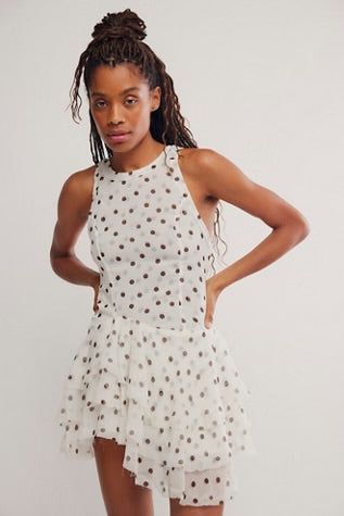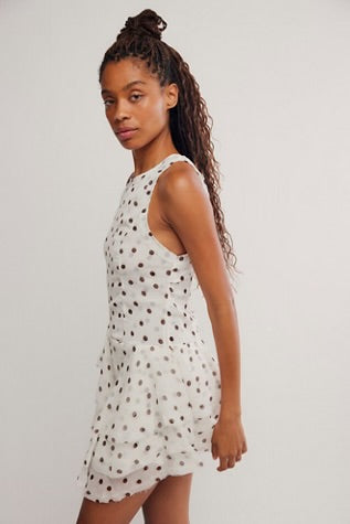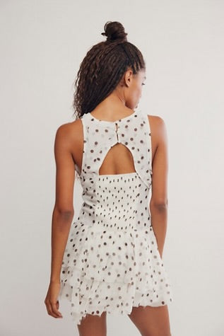 Printed to perfection in a forever flattering, swingy silhouette, this stunning mini dress features a tiered ruffle skirt and smock-adorned back for the sweetest femme finish.