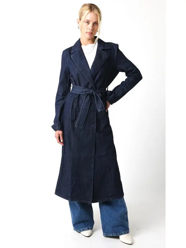 Our Lindsey Denim Coat features a tie waist and a button closure.