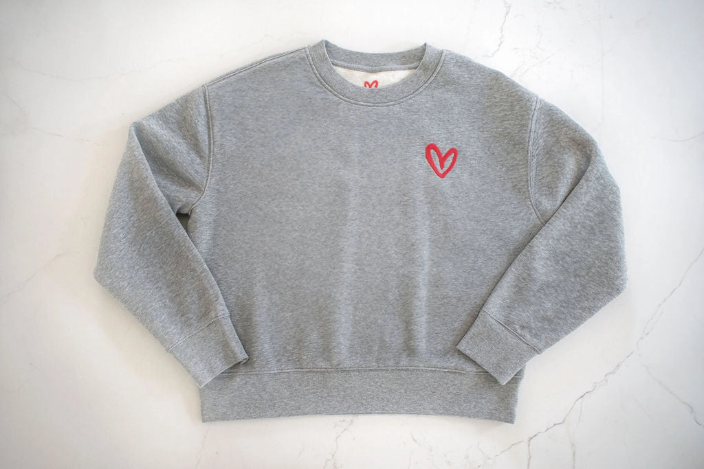 Live What You Love: Our favorite crew with our best selling Graffiti design. Super soft + relaxed fit. Signature Imperfect Heart Embroidered heart on front and large graffiti "spray-painted" imperfect heart on back! Comfortable Fit: An everyday relaxed fit sweatshirt that looks good wherever you go. Quality Craftsmanship: Pullover crew, drop shoulder, crew neck. Mid weight, 9.4oz 80% cotton 20% recycled polyester anti-pill fleece, sleeve cuff ribbing. Gives Back: $5 from every purchase goes directly to our monthly charitable partner! Sizing: True to size. Size up for cozier/oversized fit! Models wearing size small. Care Instructions: Machine wash cold, tumble dry low.